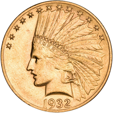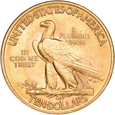 Design of the $10 Indian Gold Coin – The $10 Indian Head’s obverse (front) features the head of Liberty, donning an Indian war bonnet that reads ‘LIBERTY’. Thirteen stars representing the nation’s 13 original colonies arc above Liberty’s head. The date appears at the bottom of the coin. The reverse (back) depicts a proud Bald Eagle puffing its chest as it stands among olive branches.