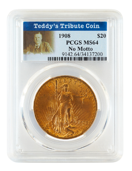 The significance of 1908 $20 Saint Gaudens Gold Double Eagle Coin “No Motto” comes from removing the motto “In God We Trust”, reflecting the president’s belief that having God’s name on the currency was sacrilegious. Public outcry was so great, the motto was returned to the coin in late 1908.