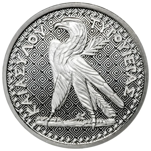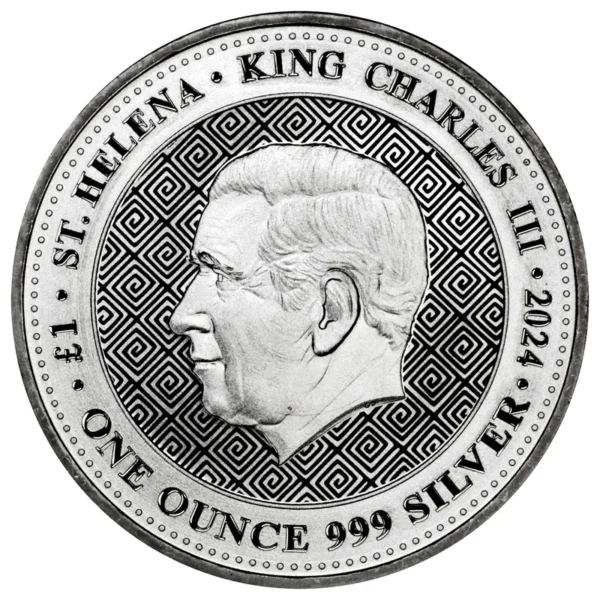 This beautiful legal tender one ounce silver coin commemorates the famous Shekel of Tyre. By the time the port city of Tyre was conquered by Alexander III “The Great” the city was famous for producing high quality silver coinage. The reverse depicts an eagle with a palm branch over its shoulder perched on a branch. The inscription is translated to “Tyre the Holy and Inviolable.” The Shekel became the only currency accepted by the Jewish authorities to pay the annual temple tax. It is believed the Shekel of Tyre is the same coin Judas received in payment for betraying Jesus of Nazareth. The obverse bears the effigy of King Charles III. Surrounded by the words St. Helena, King Charles III, the year, silver fineness, weight, and denomination.