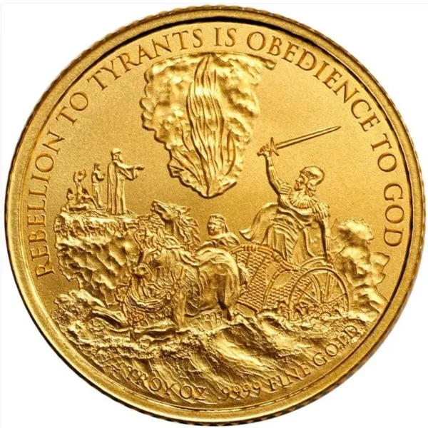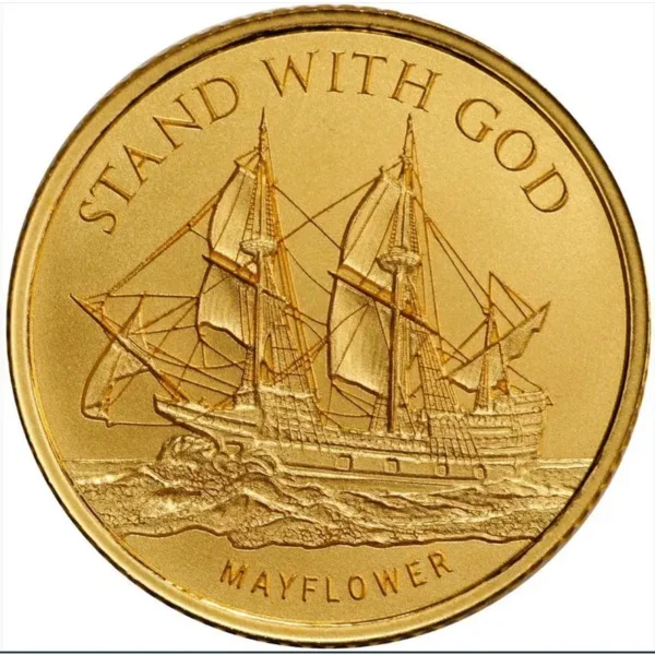 The obverse has the Mayflower sailing across the ocean with the words Stand with God. The reverse captures Franklin’s original design and motto. The commemorative bears the weight of 1/4 Troy Ounce and Fineness of .9999 Gold