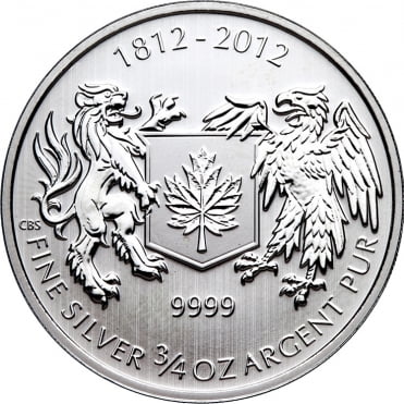 Reverse: Designed by Cathy Bursey-Sabourin, the reverse displays an eagle facing a lion, symbolizing the two combatants. Between them is a shield emblazoned with the Canadian Maple Leaf. The coin bears the inscription “1812 – 2012” and “FINE SILVER 3/4 OZ ARGENT PUR.”